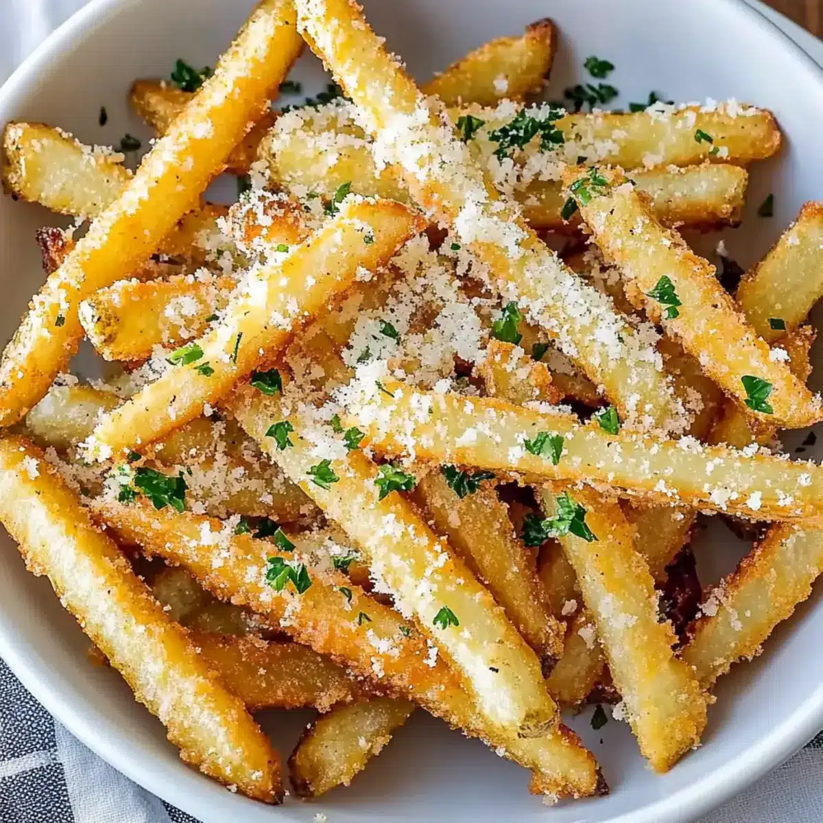 - Transfer the crispy fries to a serving bowl, sprinkle with freshly grated Parmesan cheese, and add parsley for garnish. Serve warm.