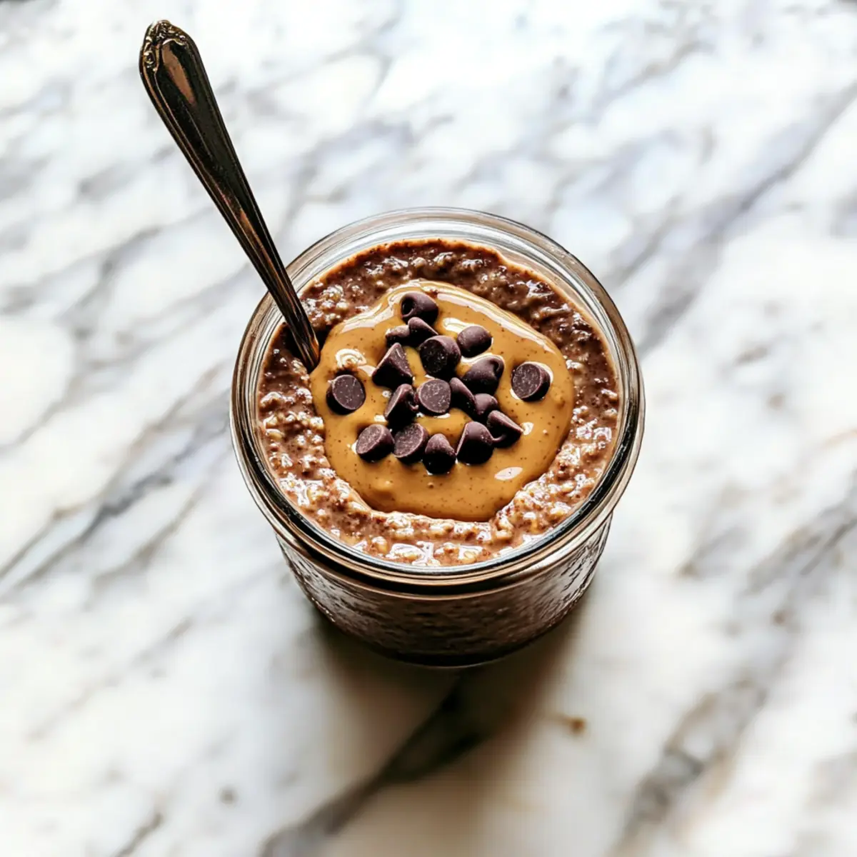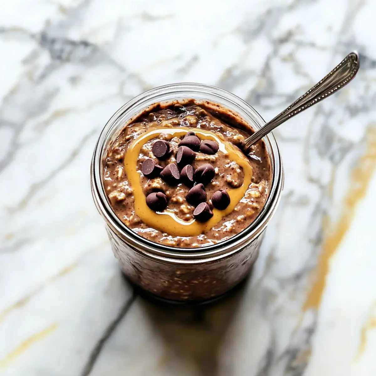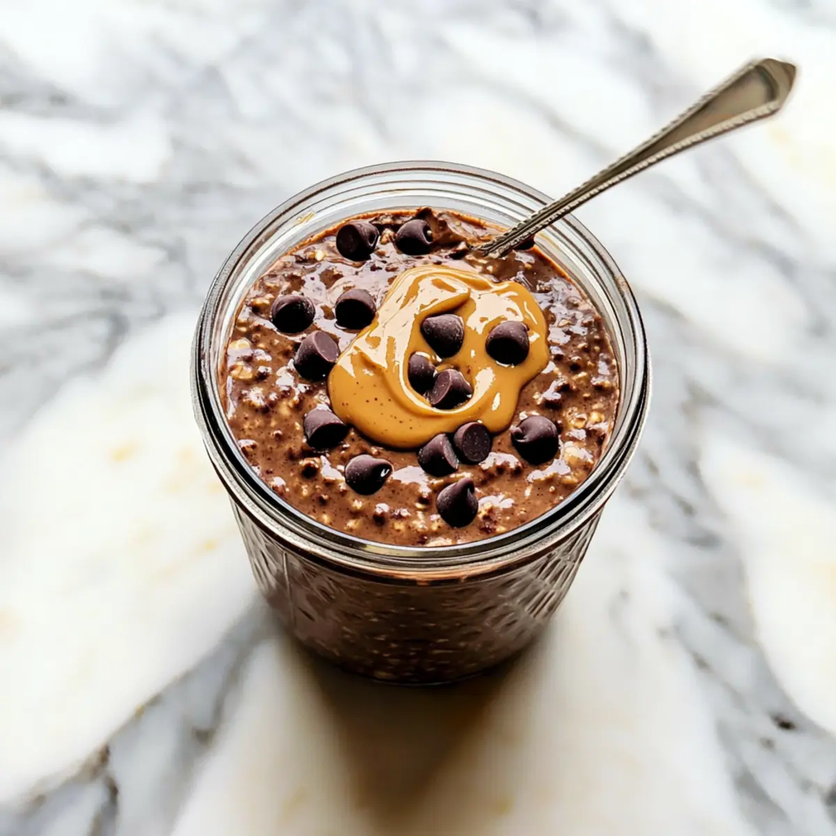 The next morning, take your jar of Brownie Batter Overnight Oats out of the refrigerator. Give it a good stir to combine any settled ingredients. If the mixture is too thick, feel free to add a splash of milk to reach your desired consistency. Lastly, top your oats with optional drizzles of peanut butter or extra chocolate chips for a fun finishing touch before diving in.