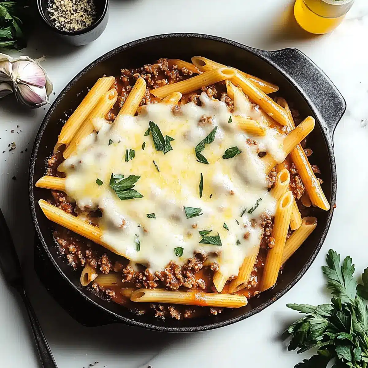 Before serving, sprinkle chopped parsley over the top for a fresh touch. This simple step not only adds color but also complements the richness of the dish. Your Cheesy Penne with Garlic Butter Ground Beef is now ready to be plated, perfect for a hearty family dinner!