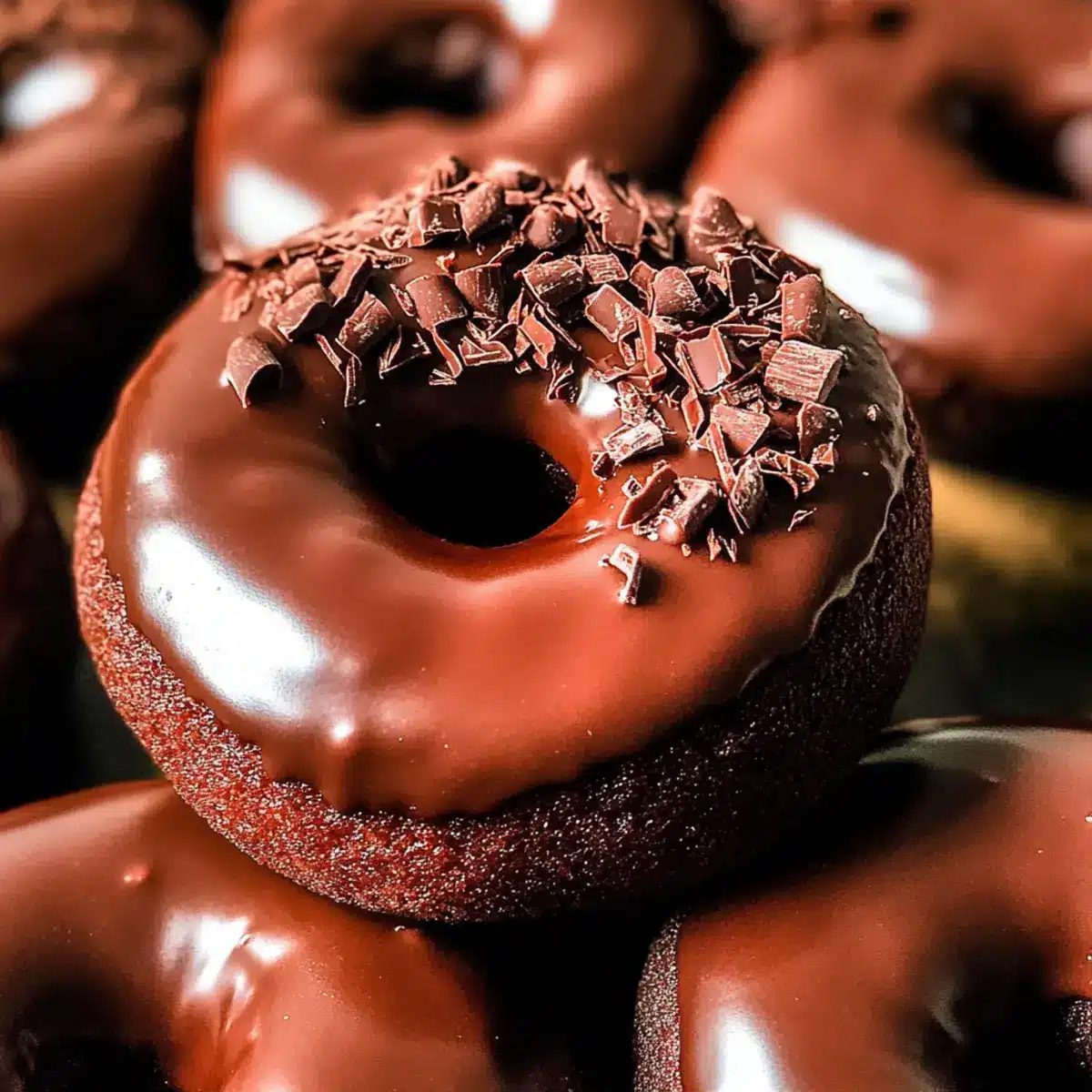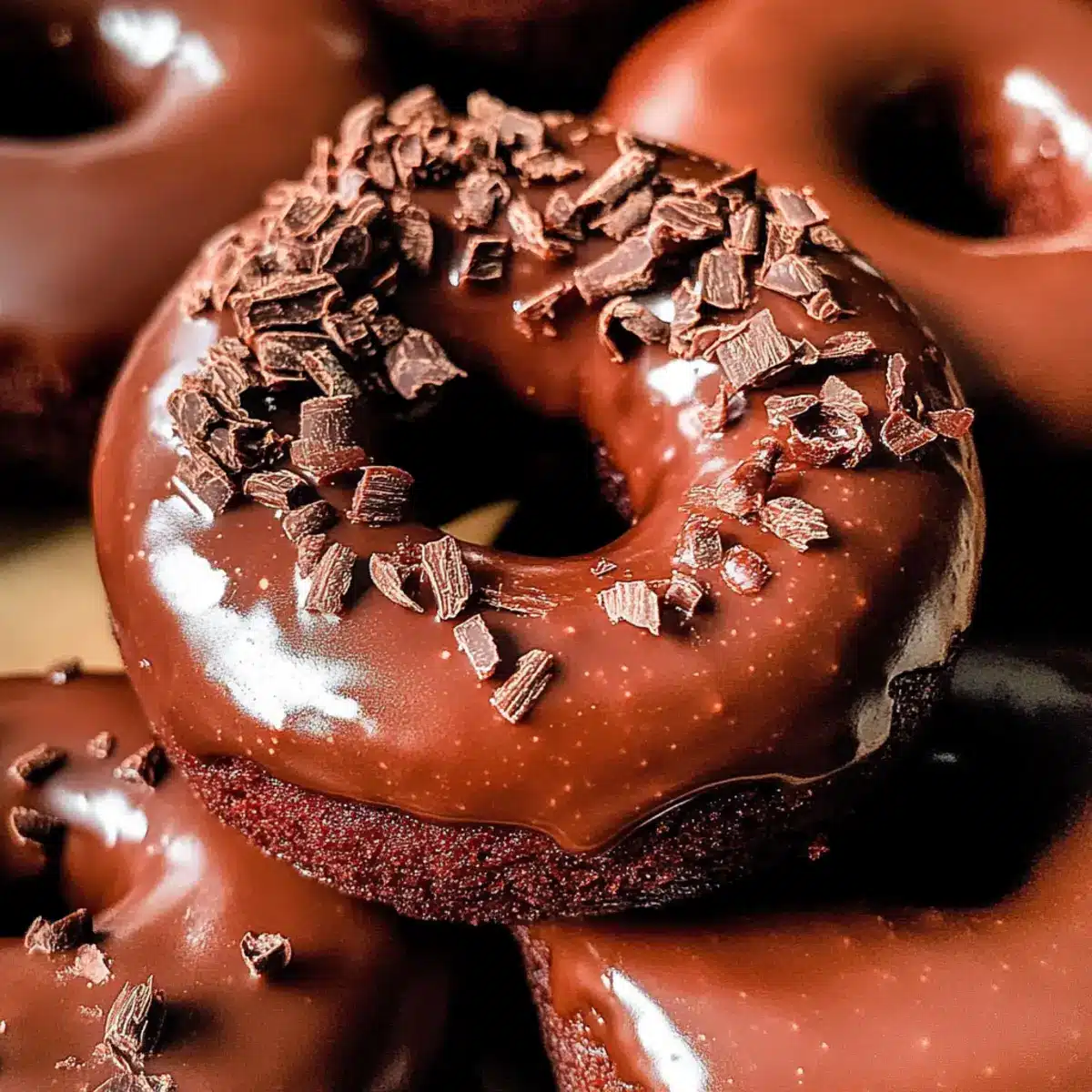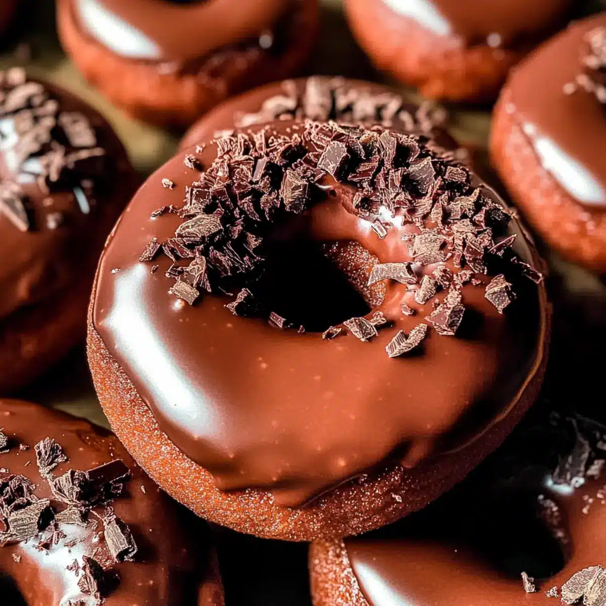 Once the donuts have cooled, dip the tops into the warm chocolate glaze, allowing any excess to drip off. Place the glazed donuts back on the wire rack and, if desired, sprinkle with chocolate shavings for a beautiful finishing touch. This adds an elegant presentation that’s sure to impress!