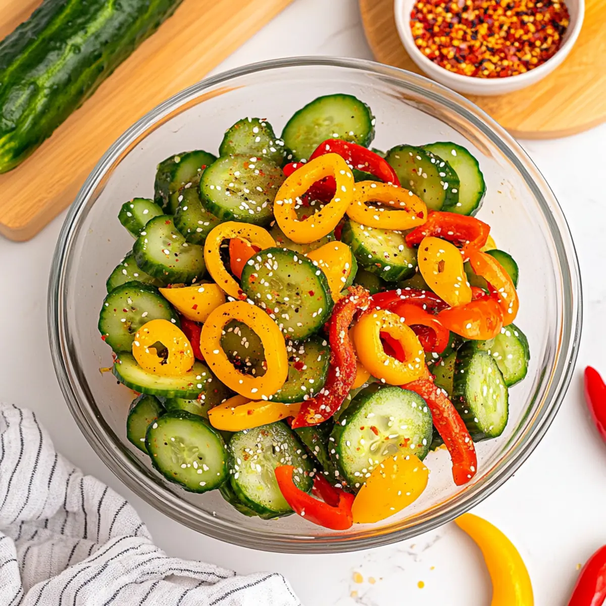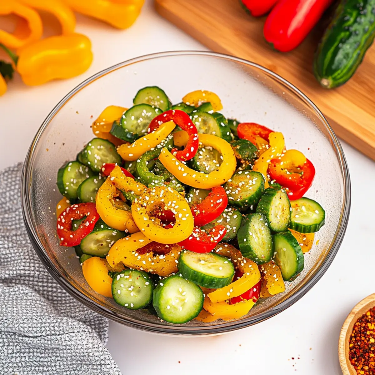 Fun Garnishes: Consider adding toppings like toasted sesame seeds or chopped fresh herbs for an extra layer of flavor and presentation that enhances your Cucumber and Sweet Pepper Salad.