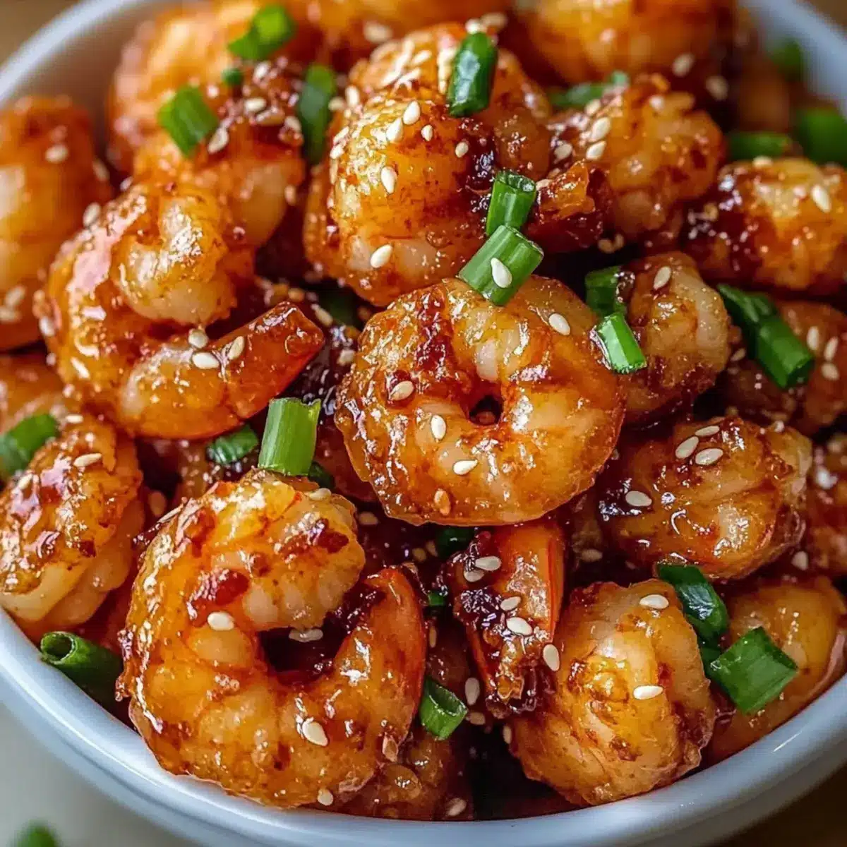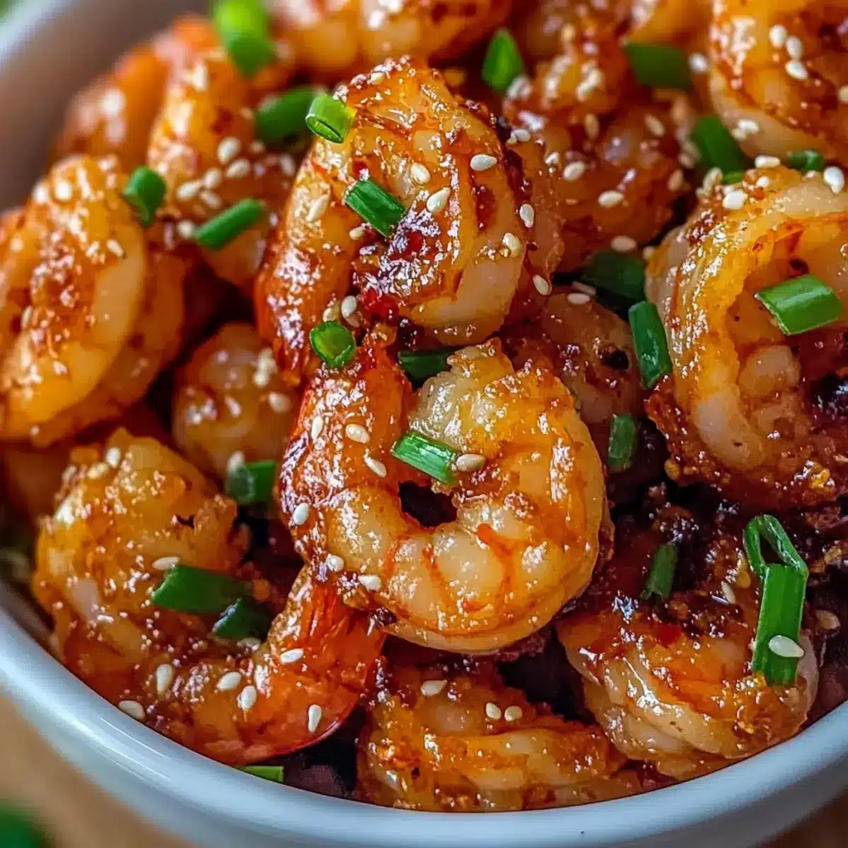 - Transfer cooked shrimp to a plate lined with paper towels to drain excess oil. Garnish with freshly sliced green onions and a sprinkle of sesame seeds. Serve hot.