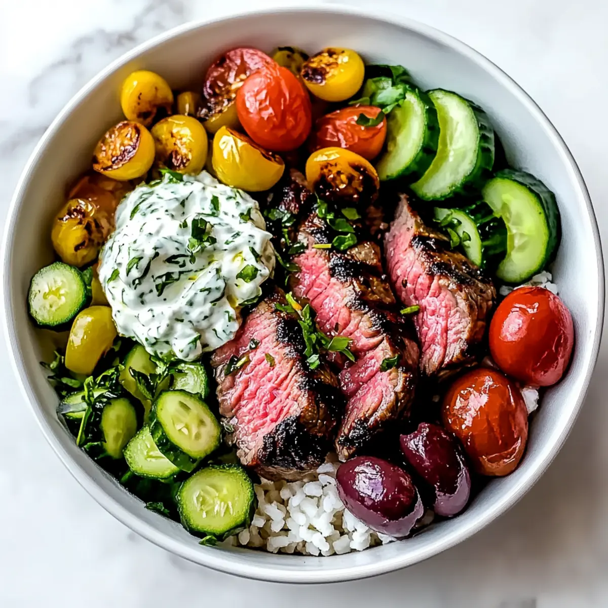 Begin assembling your Mediterranean Steak Bowl by placing a generous portion of cooked grains at the bottom of a bowl. Layer sliced steak on top, followed by fresh garden toppings such as halved cherry tomatoes, diced cucumber, thinly sliced red onion, chickpeas, and Kalamata olives. Drizzle the tzatziki and vinaigrette over the top, adding a vibrant touch to this delicious creation.