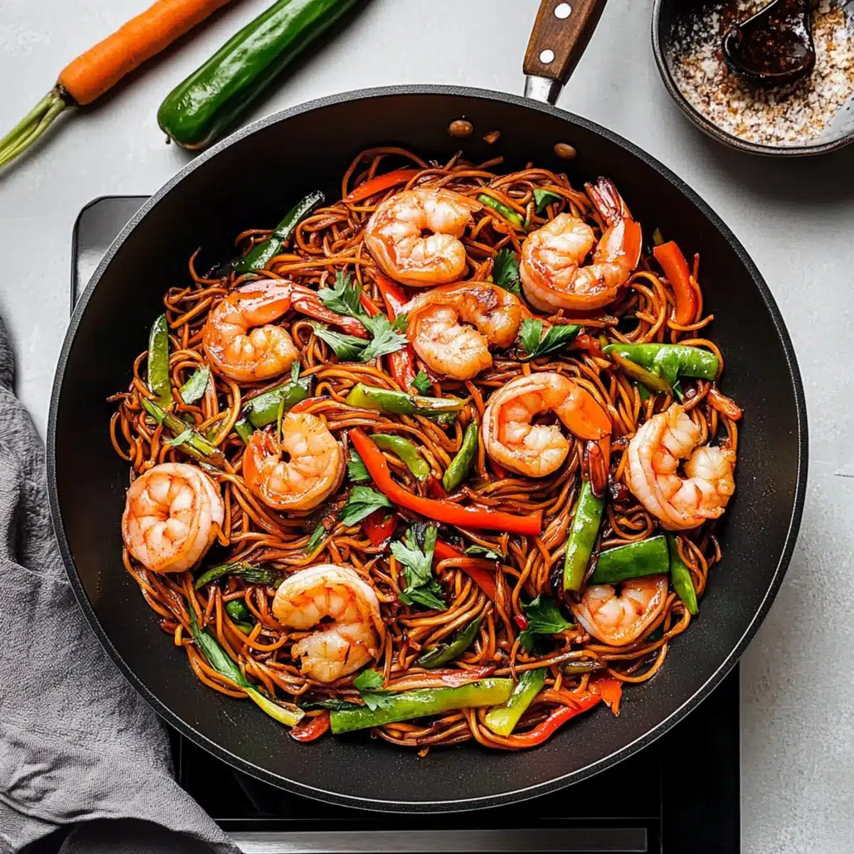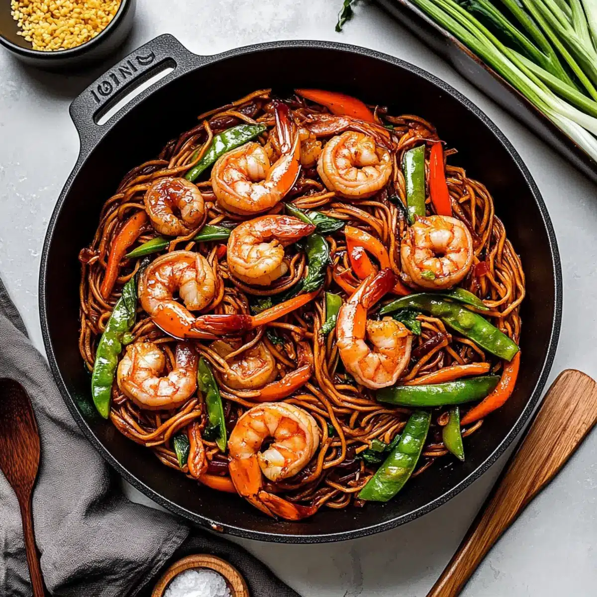 Visual Appeal: A colorful medley of vegetables, glossy noodles, and perfectly cooked shrimp creates a dish that’s as visually appetizing as it is delicious.