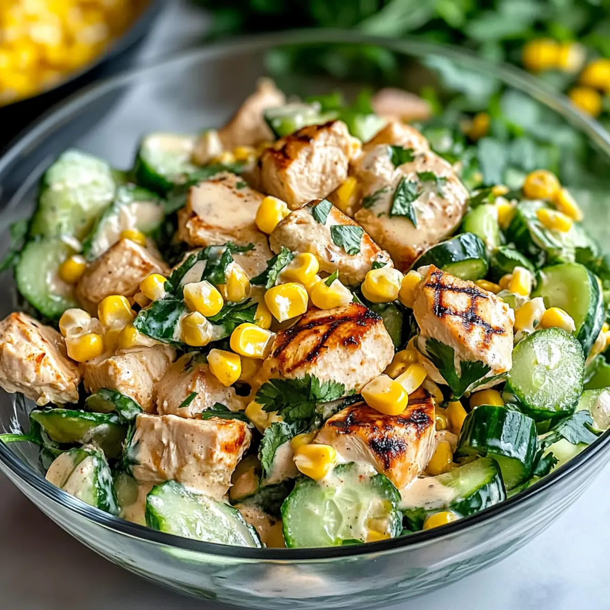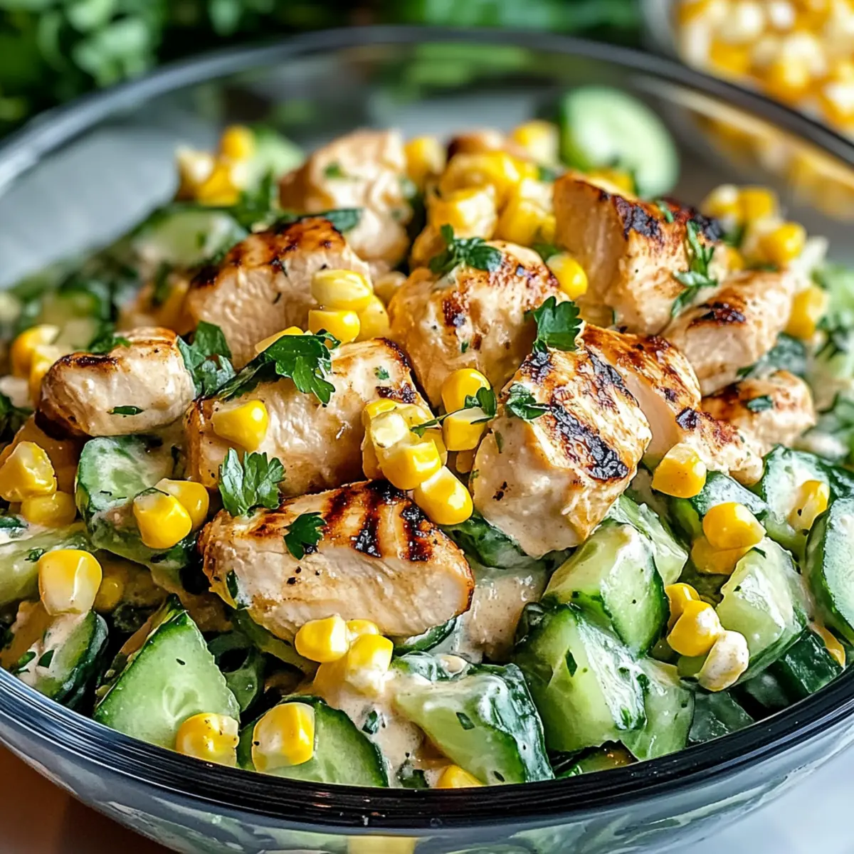 Freezer: This salad is best enjoyed fresh, but you can freeze the chicken and corn mixture in a freezer-safe bag for up to 3 months; just thaw and mix with fresh cucumbers when ready to eat.